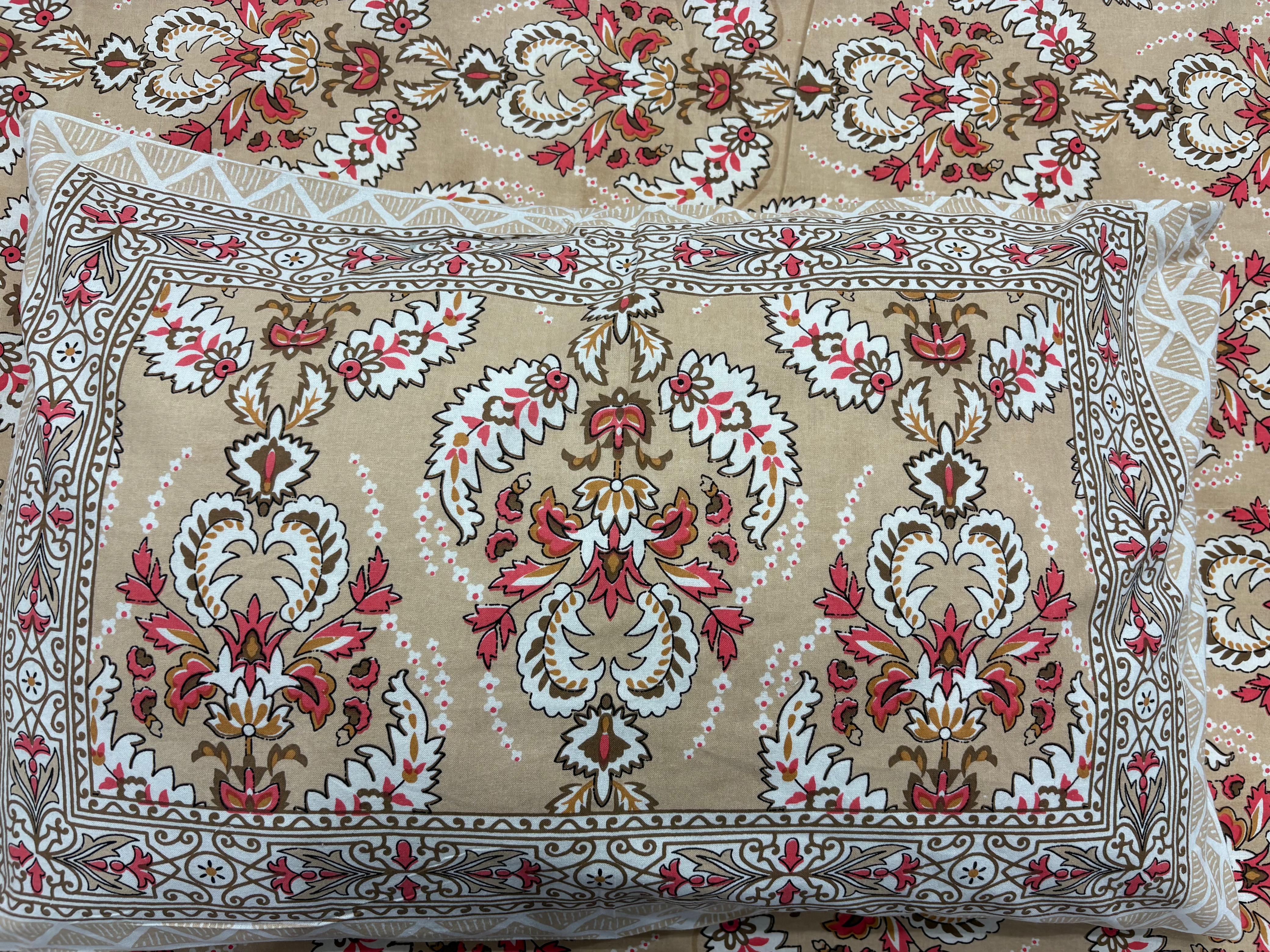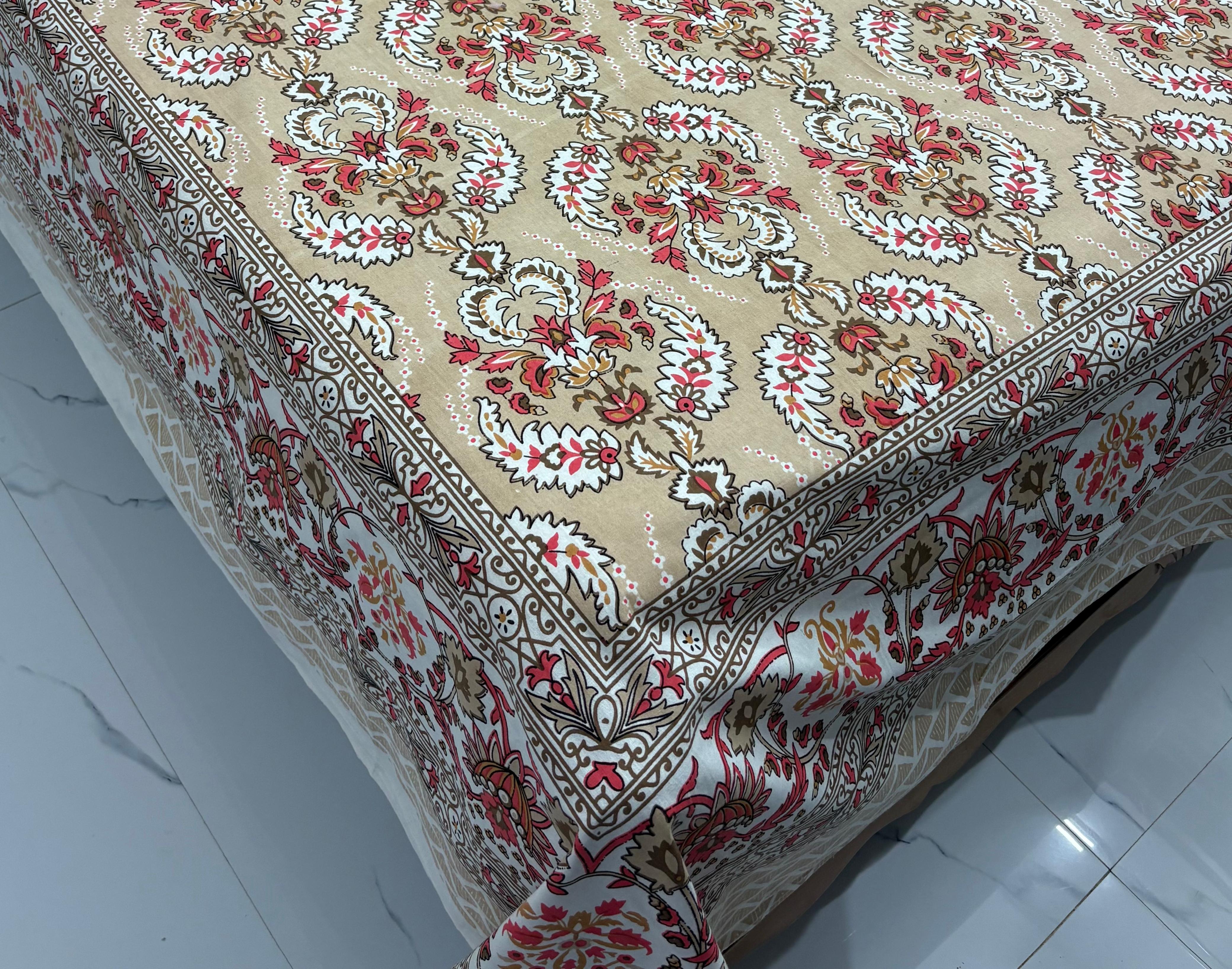 Beige & Red Damask Print Super King Pure Cotton Bedsheet | 108x108 inch